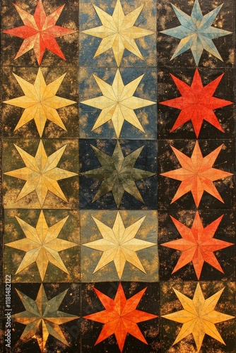 star, quilt, fabric, textile, pattern, design, patchwork, block, square, grid, geometric, repeating, textured, distressed, vintage, antique, rustic, muted, gold, orange, red, blue, green, dark, black, background, craft, hand-made, artwork