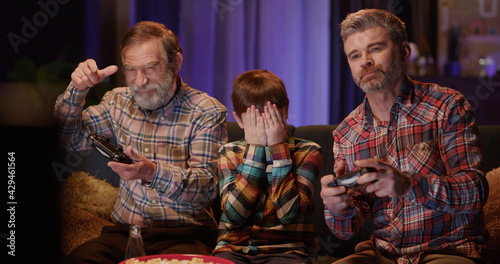 Multi-generational caucasian family of three playing console computer online video games together and eating popcorn snacks. Home entertainment.