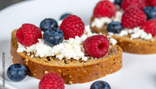 Multigrain toast with cottage cheese and fresh berries. Tasty snack. Delicious food for breakfast.