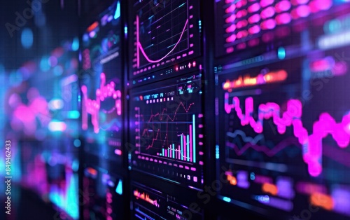 Multiple computer screens displaying colorful financial graphs and charts in a dark room with neon lighting. Technology and finance concept.
