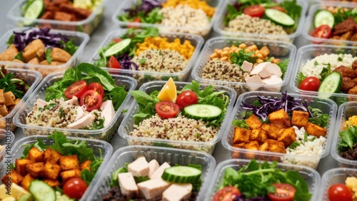 meal, container, bowl, salad, filled, packed, arranged, ready, served, kitchen, counter, table, indoor, clear, plastic, colourful, fresh, leafy, green, grain, rice, healthy, daytime, casual attire, adult, person, lunch, take, out, catering, diet, vegetarian, portion, convenience, wholesome, eating, organic, snack