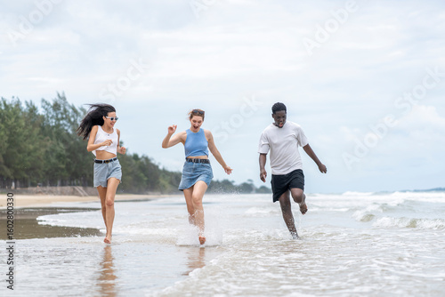 multiracial friends having fun on the beach,enjoy running in seashore together,smiling,laughing,people lifestyle,travel on summer vacations