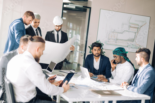 Multiracial group of constructors, builders, engeneers and architects discussing blueprint at office. All men are dressed in business suits, and white shirts, one of them wears hardhat on head
