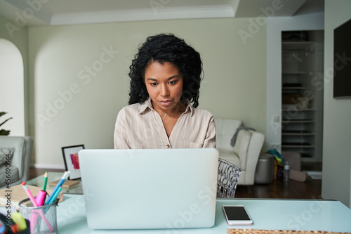 Multiracial woman wearing domestic clothes looking at the laptop screen