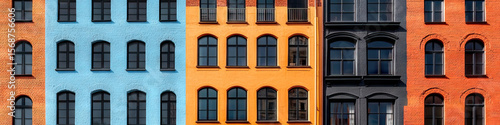 building, brick, window, facades, colours, orange, blue, grey, terracotta, light blue, uniform, multistorey, apartment, architecture, city, urban, structure, design, arched, brick building, house, home, real estate, property, exterior