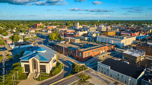 Muncie, IN at sunset with gorgeous blue sky and clouds over city with golden light aerial