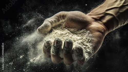 Muscular hand gripping protein powder, with dust swirling in the air, symbolizing strength training and bodybuilding efforts.