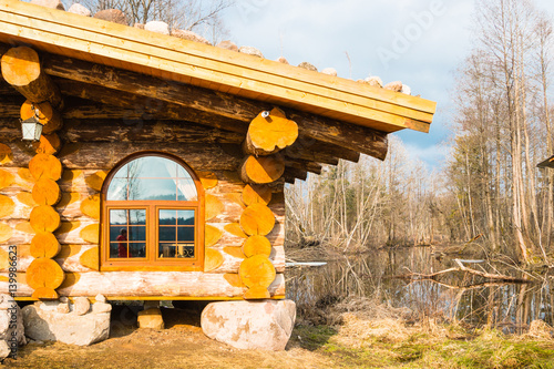 Museum complex Sula 60 kilometers from Minsk Belarus. Sight. A tourist object. The Viking house in the spring forest.