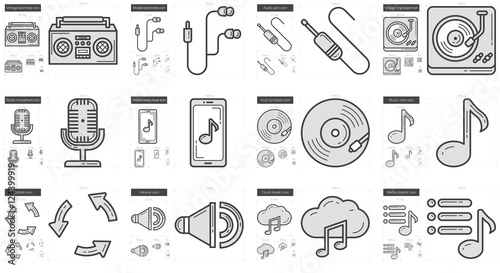 studio, update, vector, graphic, illustration, design, drawing, hand-drawn, draw, icon, black, line, flat, minimal, linear, scalable, set, white, play, audio, music, musical, media, note, vinyl, disc, listen, record, player, volume, portable, technology, retro, broadcasting, microphone, dj, receiver, cloud, mobile, gramophone, playlist, vintage, turntable, disc, phonograph, earphones