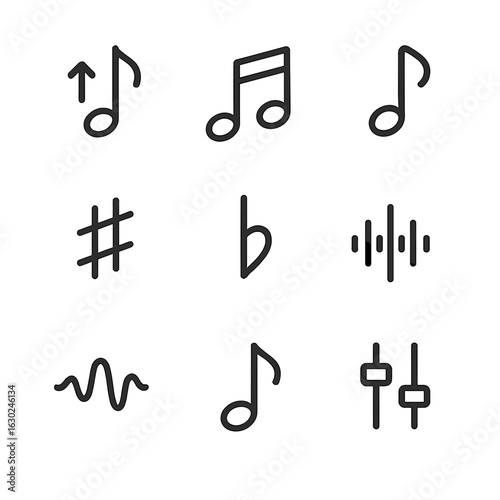 music, pitch, icon, outline, icon, set, high, low, bend, sharp, note, flat, frequency, sound, wave, tone, shift, line, only, black, colours, consistent, stroke, weight, across, all