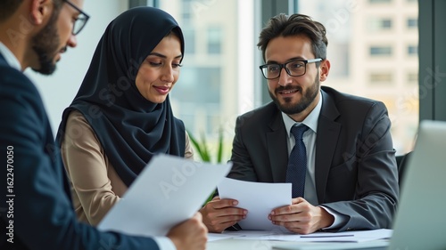 muslim manager and employee talking about the document in the office together