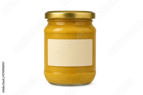 Mustard jar with blank label on transparent background, food condiment packaging design template
