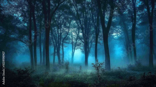 fog, forest, mysterious, eerie, blue, light, dark, tree, wood, nature, landscape, environment, mystical, magical, surreal, fantasy, dreamlike, skittish, creepy, halloween, night, twilight, morning, atmosphere, mood, abstract, silhouette, shadow, depth, depth of field, blur, bokeh, peaceful, serene, tranquil, calm, relaxation, meditation, escape, solitude, wilderness, timberland, path, trail, journey, adventure, exploration