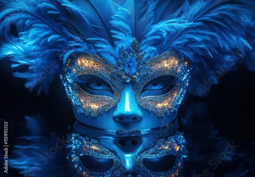 Mysterious Blue Mask with Feathers Glowing Underwater Reflected in Dark Surface, Evoking Elegance and Intrigue in a Festive Atmosphere