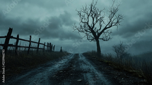 Mysterious Empty Road Under Dark Clouds with Leafless Tree and Old Wooden Fence