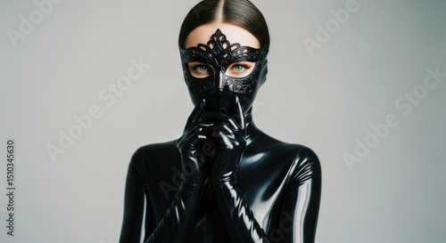 mysterious, female, black, lace, mask, leather, outfit, intricate, design, costume, fashion, elegance, eye, beauty, adult, caucasian, wearing, glove, hidden, seductive, alluring, disguise, style, dark, masquerade, dramatic, sleek, gothic, enigmatic, night, shiny, elegant, confident, chic, identity, secretive, shadowy, captivating, sophisticated, model, pose