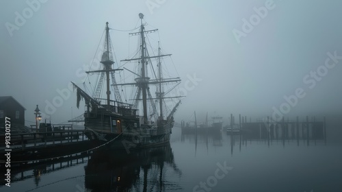 Mysterious fog envelops a historic ship docked at a quiet harbor, creating a serene and atmospheric maritime scene.