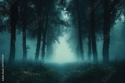Mysterious Forest Road Shrouded in Fog Haunted Woods Landscape Eerie Atmosphere Cinematic Night Nightmare