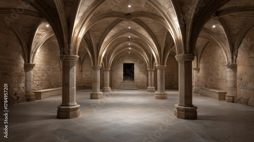 Mysterious gothic underground crypt with arched columns for historical architecture and ancient design inspiration