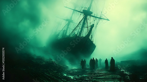 ship, fog, wreck, mystery, landscape, figure, ocean, adventure, eerie, travel, haunting, boat, sea, exploration, atmosphere, twilight, shadow, nature, abandoned, journey, ghostly, maritime, history, sailing, darkness, silhouette, storm, nautical, vessel, coast, foggy, unknown, ghost, shipwreck, ominous, surreal, tranquil, isolation, shadow, atmospheric