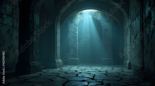 mysterious, chamber, underground, dungeon, crypt, ancient, stone, archway, light, beam, beam of light, dark, moody, cinematic, fantasy, adventure, exploration, history, architecture, ruin, abandoned, mystical, magical, mystery, secret, cave, cavern, vault, relic, temple, solemn, dramatic, atmosphere, aethereal, spirituality, spiritual, discovery, escape, path, journey, solitude, tranquil, peace, calm, deep, old, historic, sacred