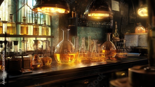 laboratory, alchemy, experiment, science, chemistry, vintage, flask, glassware, beaker, bottle, liquid, gold, elixir, potion, research, mystery, enigma, antique, old, dark, brown, yellow, amber, illumination, light, shadow, gloom, rustic, industrial, workplace, equipment, tool, chemical, discovery, investigation, secret, magic, mysterious