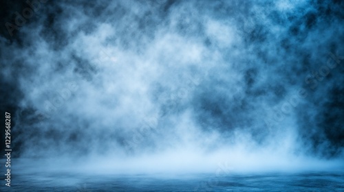 Mystic fog effect on dark floor with dramatic lighting. Ideal for entertainment, stage design, and atmospheric photography with copy space.