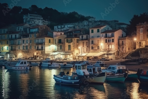 Mystic landscape of the harbor with colorful houses and the boats in Porto Venero, Italy, Liguria in the evening in the light of lanterns created with Generative AI technology