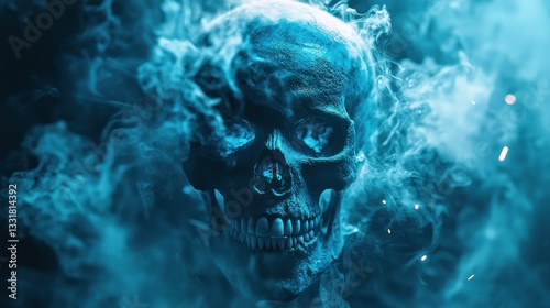 Mystic Skull Enveloped in Ethereal Blue Smoke: A Digital Artwork Depicting a Glowing Skull Shrouded in Mysterious Cyan Vapor, Creating a Spooky and Alluring Atmosphere.
