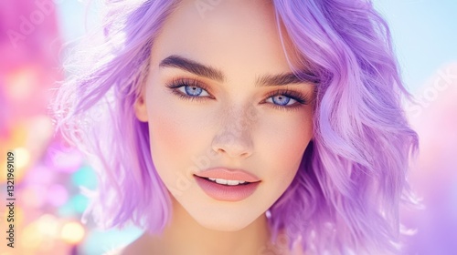 Mystical Aura: Captivating portrait of a woman with striking features and vibrant, pastel-colored hair. Her piercing blue eyes and subtle smile exude an otherworldly charm.