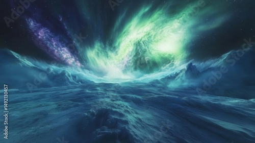 Mystical Aurora Borealis over Frozen Alien Landscape: A Breathtaking Celestial Event on a Distant Planet