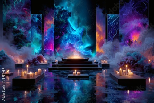 neon, candle, mist, chamber, stair, light, dark, smoke, aethereal, glowing, colourful, water, surface, altar, ceremony, spiritual, magic, energy, portal, mystical, scene, indoor, artistic, design, illumination, tranquil, atmosphere, texture, abstract, pattern, stage, display, event