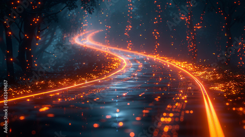 Mystical, glowing pathway winding through a dark, enchanted forest at night.