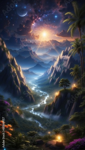mountain, vale, river, sunset, sky, star, moon, cloud, forest, tree, jungle, nature, landscape, art, digital artwork, illustration, fantasy, magical, mystical, peaceful, serene, tranquil, dreamy, mountain, cloud, tree, sunrise, panorama, view, outdoors, fog, sea, hill, snow, cloudscape, sun, green, beauty, morning