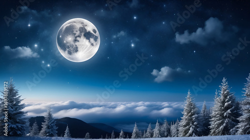 Mystical Night sky background with full moon, clouds and stars. Moonlight night with copy space for winter background