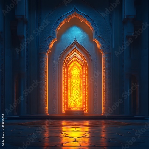archway, door, light, glowing, illuminated, ornamental, arabic, islamic, architecture, design, fantasy, portal, mystery, spiritual, illumination, stone, marble, intricate, pattern, decorative, detail, entrance, passage, hidden, secret, journey, night, moonlight, luminescence, window, stained, glasses, eastern, middle, east, ancient, palace, grand, elegant, beautiful, modern, digital, art, illustration, three-dimensional, image, visualisation, interior, building