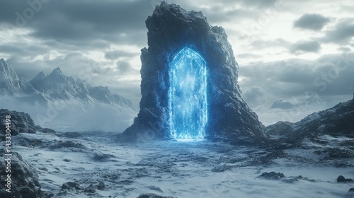 Mystical portal emits blue light illuminating snowy terrain distant mountains adding dramatic flair surreal vista.