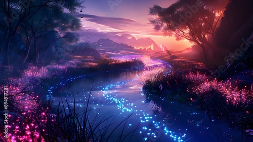Mystical river winding through a dreamlike landscape of glowing flora