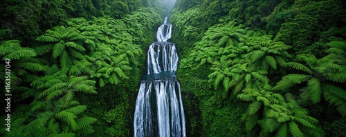 Mystical serene idea. A serene waterfall cascading through lush green ferns in a tranquil environment.
