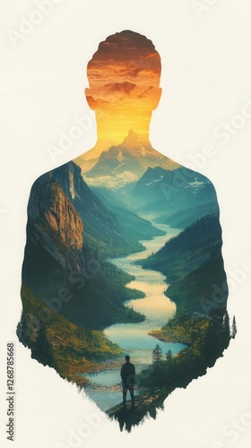 Mystical silhouette of a man overlooking a serene mountain landscape at sunrise with a flowing river beneath a colorful sky