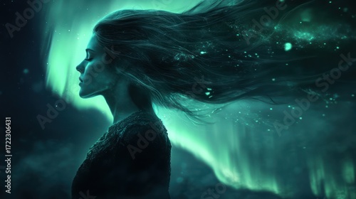 aurora, borealis, woman, aethereal, mystical, energy, flow, profile, fantasy, celestial, dreamlike, serenity, spiritual, elegance, cosmic, wonder, beauty, inspiration, luminescence, vibrant, teal, harmony, atmosphere, graceful, silhouette, artistic, background, calmness, clarity, connection, emotion, female, flowing, hair, imagination, magic, moonlight, nature, peaceful, radiant, tranquil, universe
