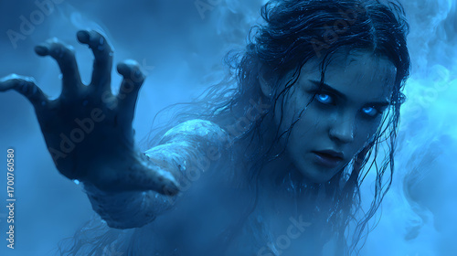 Mystical woman with glowing blue eyes reaching out in a dreamy blue atmosphere AI Generated