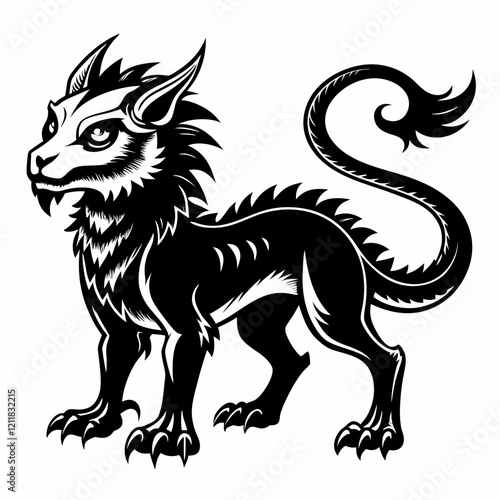 mythical, creature, black, white, chimera, fantasy, drawing, beast, dragon, lion, hybrid, tattoo, decoration, legend, tail, claw, horn, scale, mystical, mythology, fierce, animal, vignetting, detailed, outline, elegant, graphic, symbol, powerful, fictional, creative, unique, style, abstract, ornamental, creation, monochrome, legendary, magic
