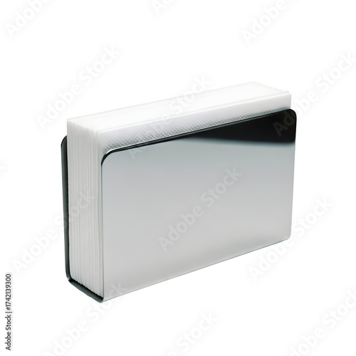 napkin, holder, stainless steel, metal, white, stack, pile, tissue, clean, dining, tableware, kitchen, utensil, rectangle, isolated, transparent, background, object, design, texture, surface, reflective, shiny, modern, minimal, simple, product, presentation, copy space, lifestyle, service, eatery, food, paper, hygiene, domestic, household, accessory, arrangement, horizontal, studio shot, nobody, template, editable, visual