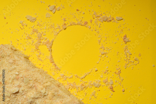 Napoleon cake on a yellow background. Filmed from above. Place for a logo.