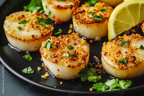 National Baked Scallops Day, March 12, spicy scallops topped with breadcrumbs, on a matte black plate. Each scallop features a golden crust with flecks of chili flakes