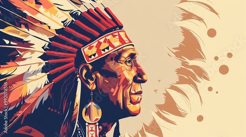 Native American Heritage Day, poster with an illustration of a Native American in a feathered headdress on a beige background. Space for text.