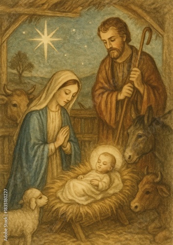 holiday season, illustration, holy family, christ child, christian, christmas, religious, tradition, wallpaper, biblical, nativity, holiday, setting, vintage, family, joseph, manger, season, jesus christ, scene, story, baby, holy, mary, art