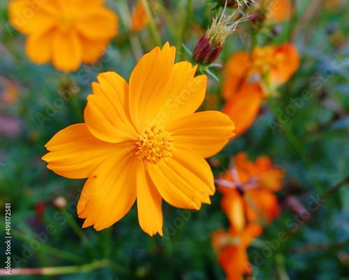 Natural background of Cosmos sulphureus, yellow cosmos flowers blooming in the garden on green background. flower in the morning. macro photo