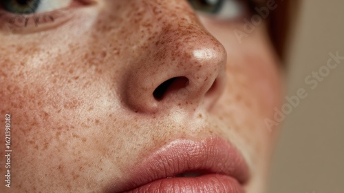 Natural Beauty Close-Up Highlighting Freckles, Pores, and Smooth Skin Against a Gradient Background for Minimalistic Composition